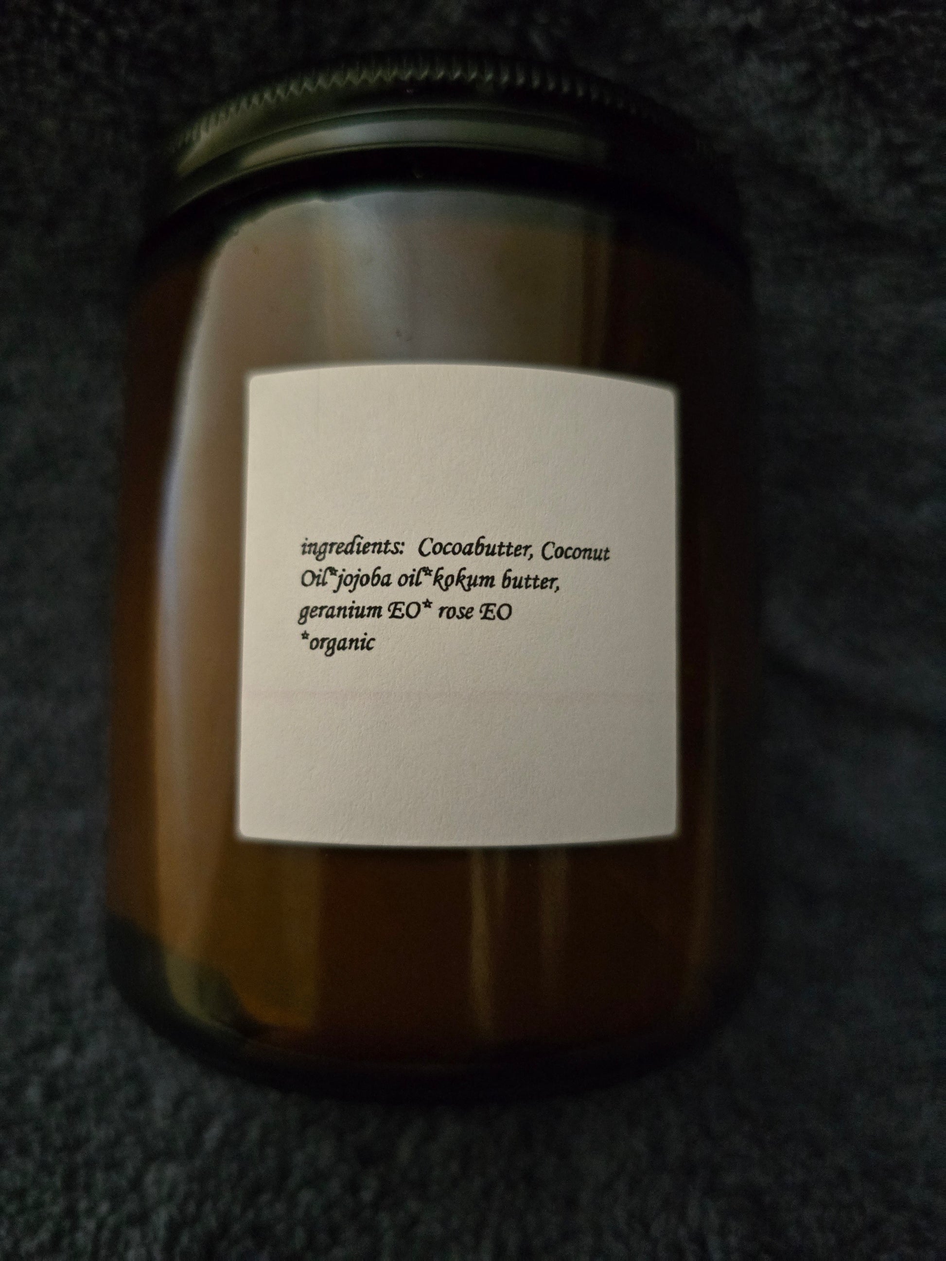 Organic cocoa butter, organic coconut oil, organic jojoba oil, organic kokum butter, organic geranium essential oil, organic Rose Absolut essential oil.